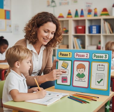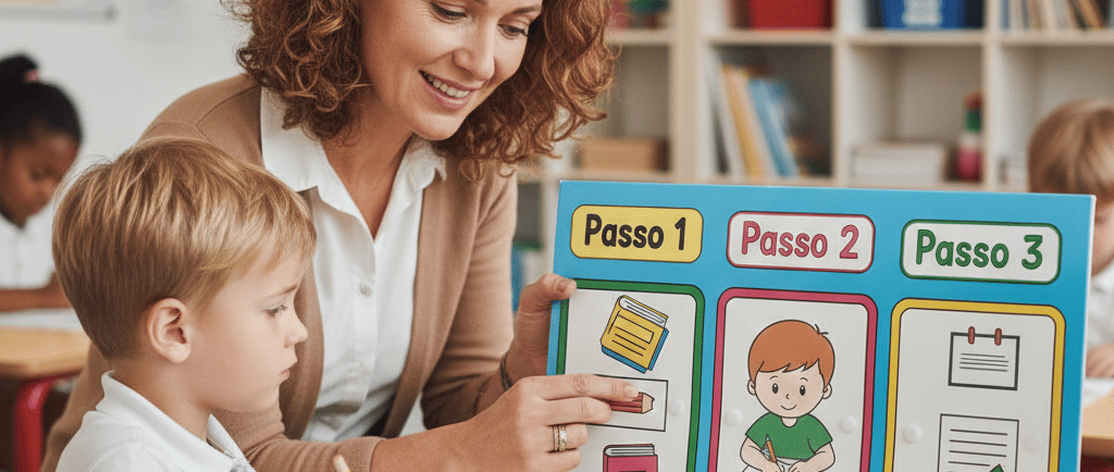 Muitas vezes, o aluno entra em crise porque a tarefa parece impossível. A ABA sugere a Decomposição de Tarefas (Chaining).