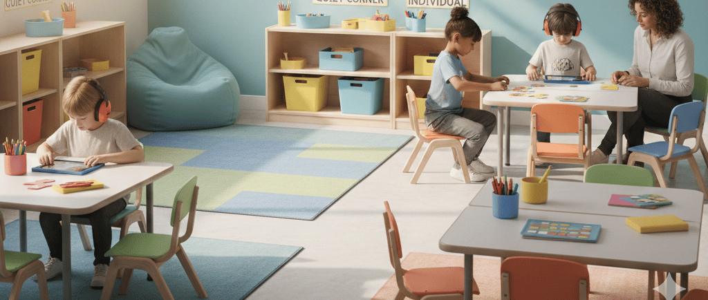 Estruturação do Espaço Físico: Delimitar as áreas da sala de aula por função (área de trabalho individual, área de descanso, área de brincadeiras), usando barreiras visuais claras.