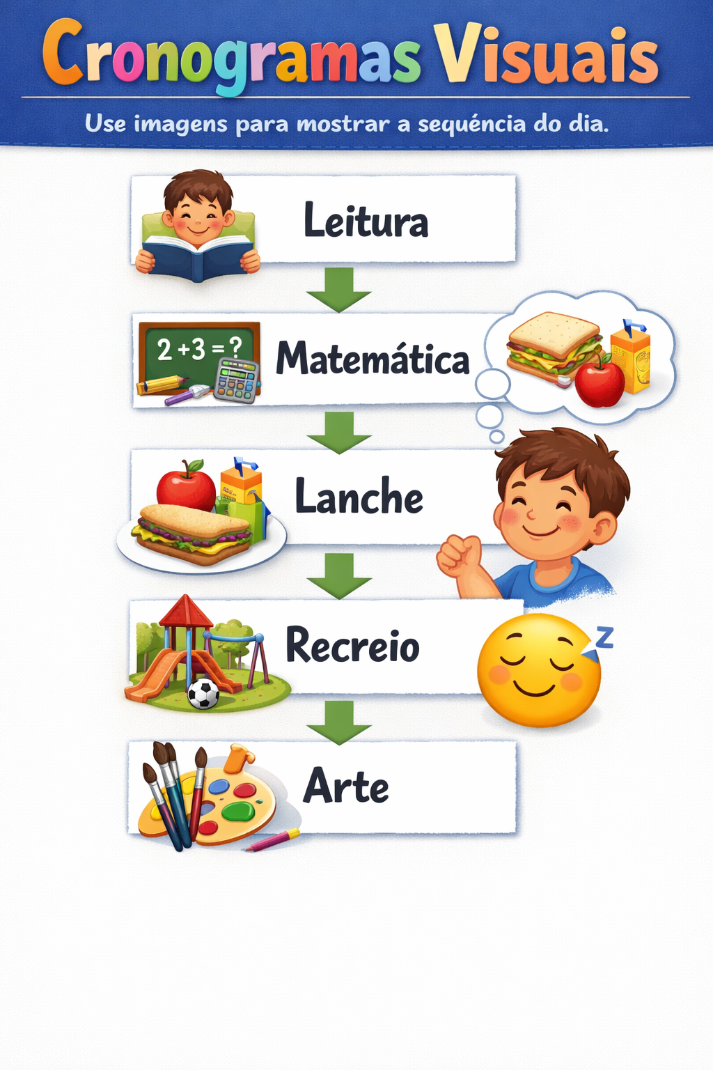 Cronogramas Visuais: Use imagens para mostrar a sequência do dia. Quando o aluno vê que o "Lanche" vem depois da "Matemática", a ansiedade diminui.