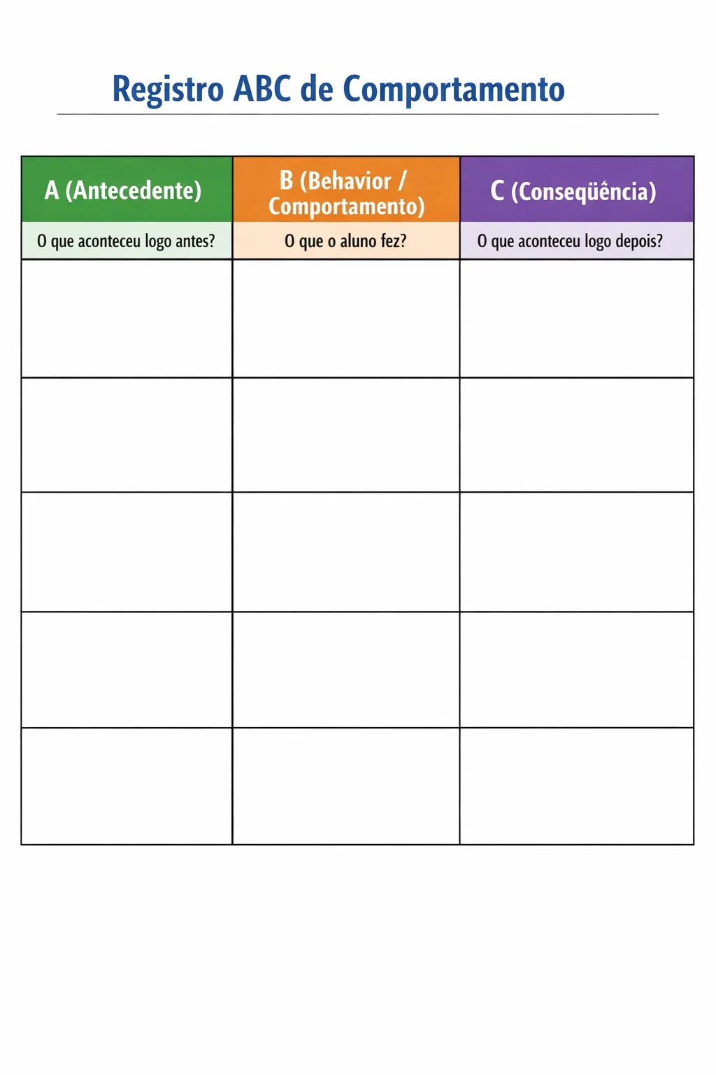 B (Behavior/Comportamento): O que o aluno fez? (Ex: Gritou e se jogou no chão).