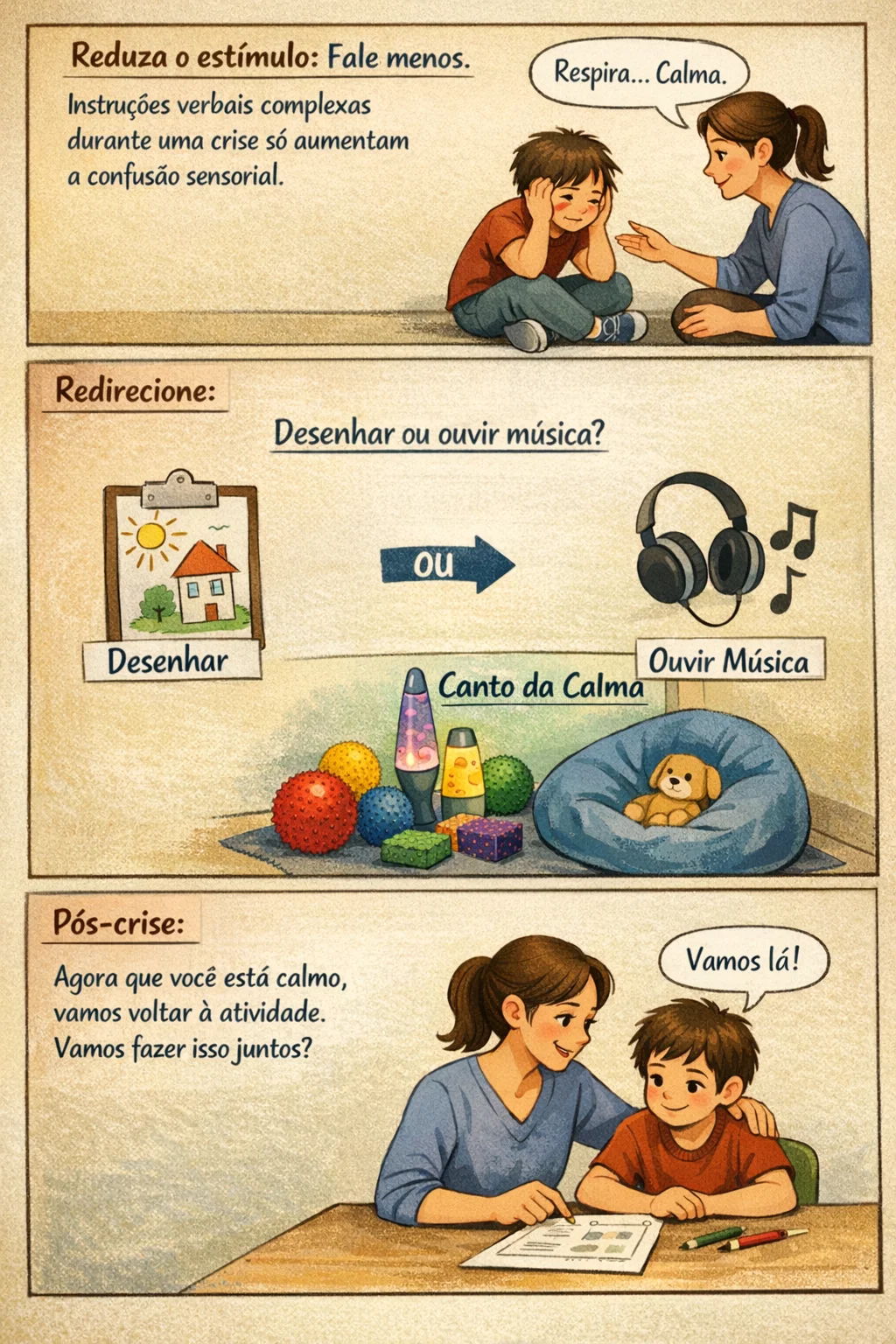 Reduza o estímulo: Fale menos. Instruções verbais complexas durante uma crise só aumentam a confusão sensorial.