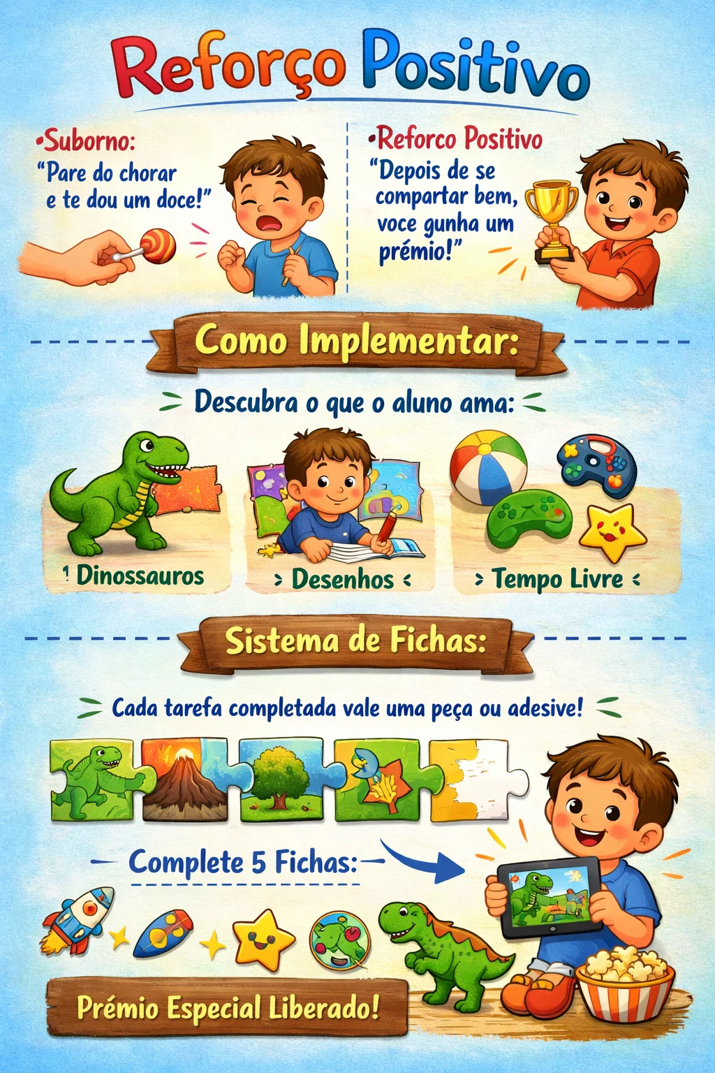Como implementar: Identifique o que o aluno ama (dinossauros, desenhos, tempo livre).